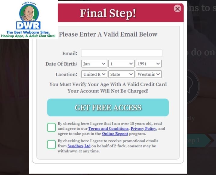 To get started, you will need an email address. 2Fuck also requires your date of birth and location along with your credit card details. Signing up is free and you won’t be charged until you use the paid services.