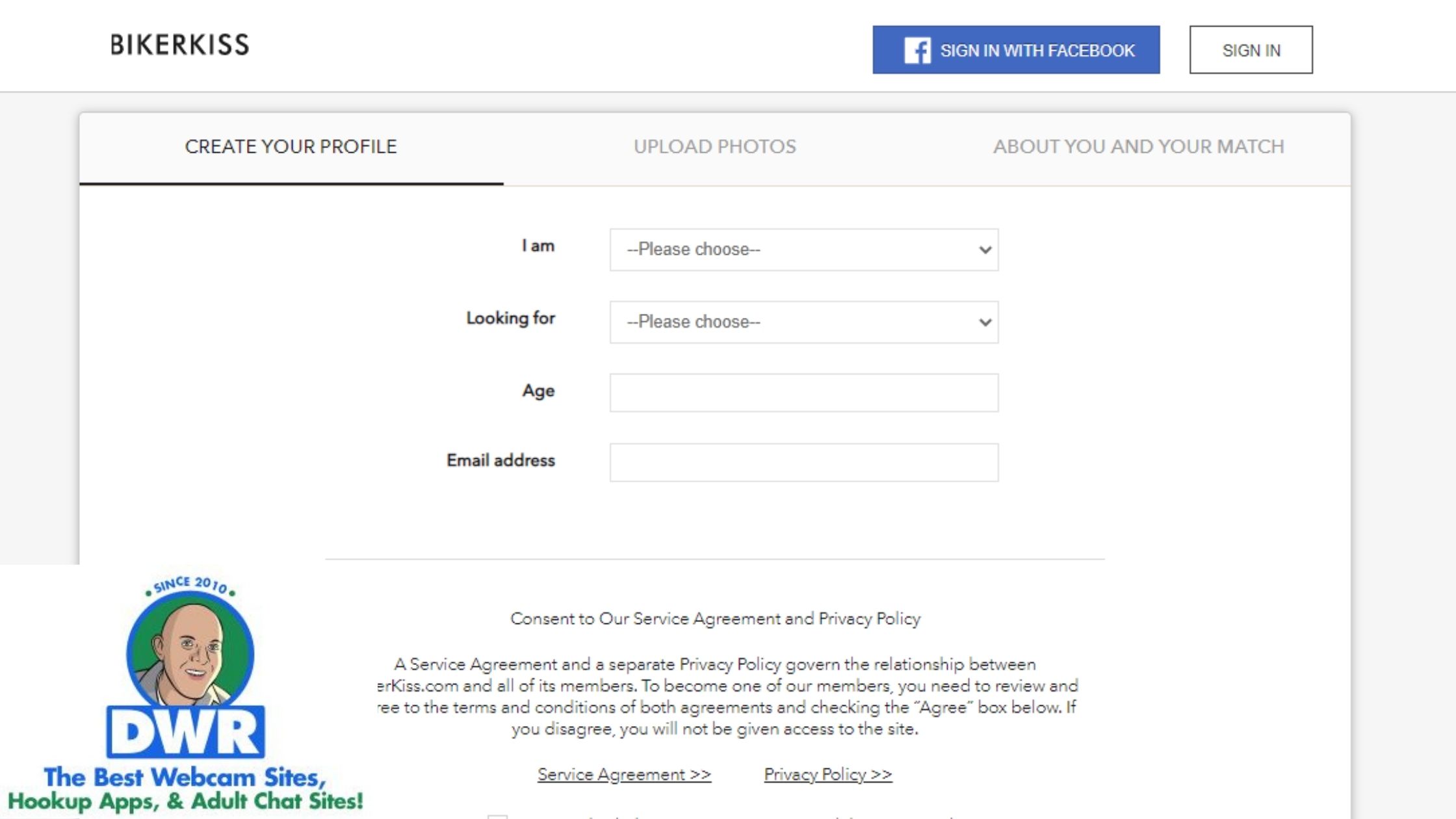The users can sign up at bikerkiss either through Facebook or by email from the form presented on the left of the homepage. I would prefer email signup rather than risking my personal Facebook account for shady dating sites.