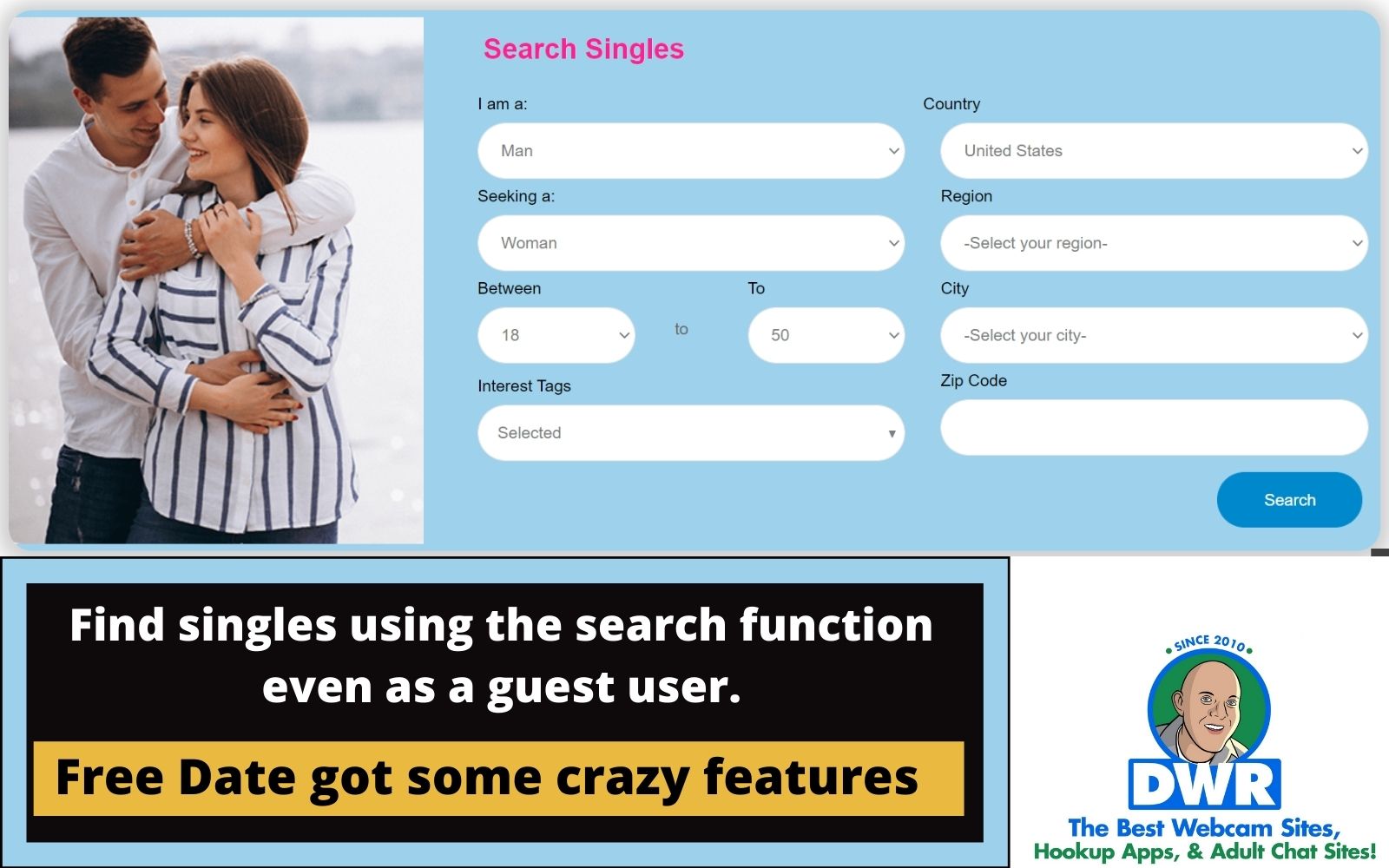States – This section shows the 50 states of the USA and its popular cities where users are more. Pretty much like Match (review at the link) dating site, but with a lot of free features to communicate with users.